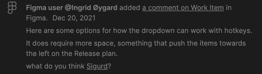 Suppose a discussion happening in Figma is relevant for a work item. In that case, you can simply reference the work item by it’s number, and the comment will appear in the work item’s activity feed, and the members will be notified. To do this, copy the work item number (Ctrl+I or ⌘+I) and add it to the comment in Figma. This creates an activity with the content of your comment and a link to it. We will also notify any assignees or watchers about the update. This is a great way to ensure that the team never loses a relevant discussion or comment.